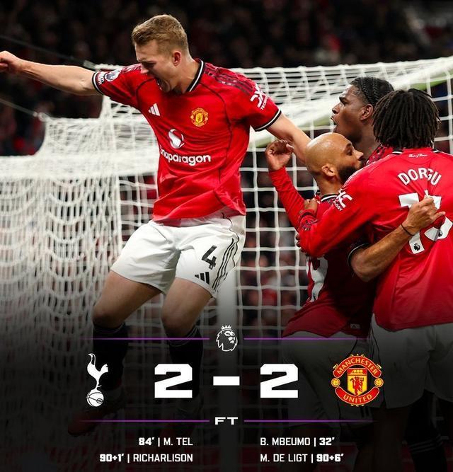 双方成功上演2-2神剧情,热刺7分钟连进2球补时逆转比分,但曼联拒绝被逆转,德里赫特压哨读秒破门!